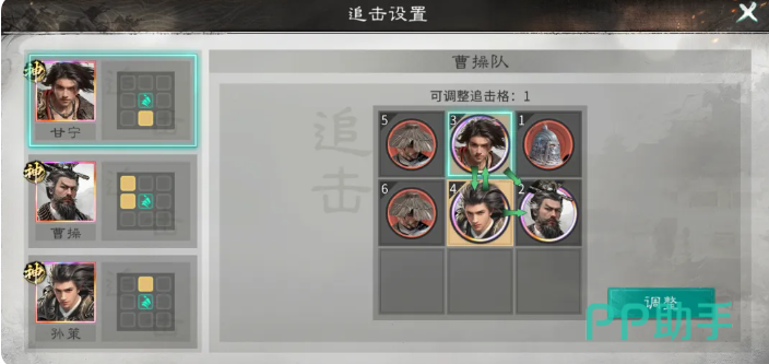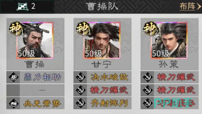 根据这样的曹操用法,大家可以组成一个曹操、孙策、甘宁搭配的强攻阵容,这个阵容当中用到的一些压制能力就是其中最重要的效果,如果大家想要实现减员的话,在其中就要注意这里阵容站位有一些技巧,一般曹操是不站追击格的,因为他自身拥有两个追击格,所以需要孙策和甘宁站在曹操的追击格上,同时两人之间也要互站追击格,这样才能保证三人之间的追击效果得到最大的加成,又能得到曹操带来的辅助加成,阵容当中大家可以利用曹操的天赋带来一定的防守,开局覆盖的10 层奸雄buff可以提供一定的减伤,受对面攻击的时候这里就可以消耗奸雄的层数来夺取敌方四维属性,然后就可以选择转移给孙策以及甘宁。
