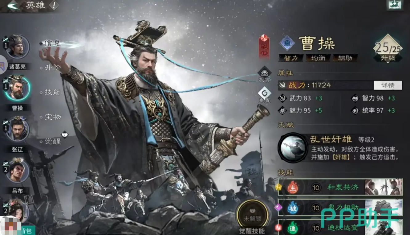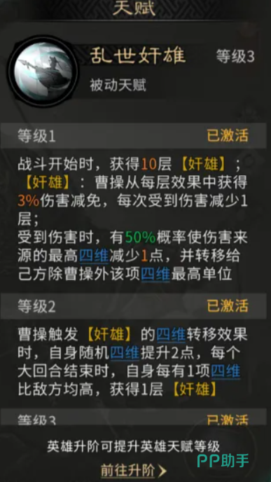 后期在曹操的天赋解锁3级后,这里曹操只要是转移其中偷取到的四维属性时,还会根据四维类型效果来为队友增加更多的额外增益,比如转移武力属性的同时,有一定的概率可以给队友增加吸血的效果,而如果是转移的统率属性,则有可能在其中提升队友的格挡几率,转移智力或者是政治类型效果的话,在其中也能对应获得输出合作和是资源类的相关加成。曹操除了基础的天赋之外,其实还有一个觉醒技能就是天下归心。