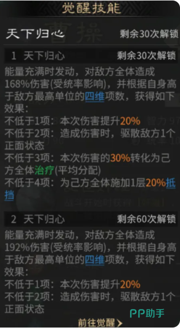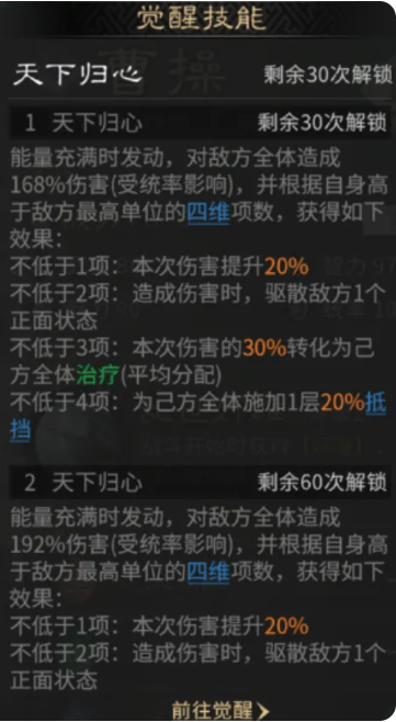 天下归心这个觉醒技能在游戏中也是有比较高的战术效果,其中是可以针对全体敌人释放的技能,但是其中的效果好坏则是取决于曹操的四维属性是否能够碾压对手,具体就是根据这里对比敌方四维最高的单位来确定,如果是其中的数值有一项是压制了对面四维的话,曹操就可以给己方全体的成员都带来伤害加成,如果是其中能够压制对面2项属性的话,这里就可以驱散己方全体负面状态,如果是压制3项属性,则是我方全体的成员都可以恢复自身一定的兵力,最高的就是4项全部都比敌人高,此时带来的就是己方全体有更高的格挡效果可以用,所以根据这个觉醒能力曹操在自身的四维数值越高的情况下,其实他能够带来的技能效果就越全面。