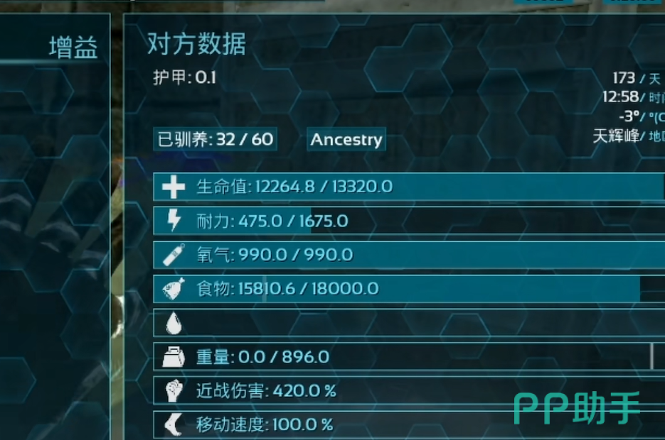 它最特别的地方是有一个回血技能,可以给附近友方生物回血。这个功能在打架,或者养恐龙的时候挺有用,不过代价是消耗饱食度,而且消耗量很大。本来凶齿豨的饱食度就掉得很快,开了回血之后更是掉得飞快,所以养的时候,要备足食物,随时补充,不然一不留神就饿死了。