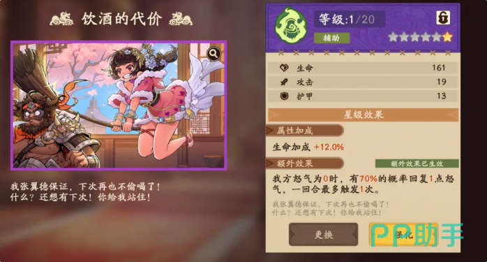 如果大家没有拿到这个最适合他的溯影效果,那么建议大家可以在前期比较容易拿到的紫色溯影里面选择,那么此时就要注意他在效果当中如果能够补充一定怒气的话,这里是比较适合郭嘉的,这里建议大家可以考虑一下饮酒的代价,这个溯影目前在效果当中就是可以给大家带来足够的辅助效果在其中,基础的生命加成是有12%的数值,而另外在触发的额外效果当中,是我方的怒气数值只要是为0的情况下,其中就有70%左右的概率可以让角色身上恢复1点的怒气数值,不过,这个溯影的效果在限制当中,就是每一个回合里面只能用到一次,所以后期如果要用的话,是一定要把等级给强化起来,这样能够带来的百分比才会更高一些,作为一个可以替代的溯影效果,这个能力让他提升了自己生命数值的情况下,其实也是可以加强一部分的战场能力,但是强度上面绝对是没有世之奇才这么强的。