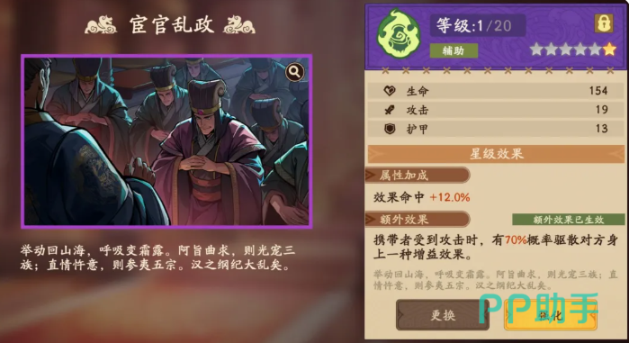 最后还有一个选择是宦官乱政,目前在紫色的溯影当中也是比较适合跟郭嘉放在一起用的,不过在用的时候大家就要注意,基础的效果是增加的命中上面12%的增强,而并不是生命效果,另外在额外携带的能力当中,是郭嘉受到对面攻击的情况下,有70%的概率可以驱散敌人身上的一种增益能力,这个效果放在这里用的话,可能没有前面三个溯影那么突出,但是也可以跟郭嘉短暂的搭配一下,这样可以保证郭嘉在阵容当中不死,后期的话他携带了铁索连环之类锦囊的话,就可以利用这个溯影将其中关键的一些buff给驱散掉,这样对面吃不到增益的情况下,我方郭嘉才可以拿出更多的辅助功能来提升武将的强度。