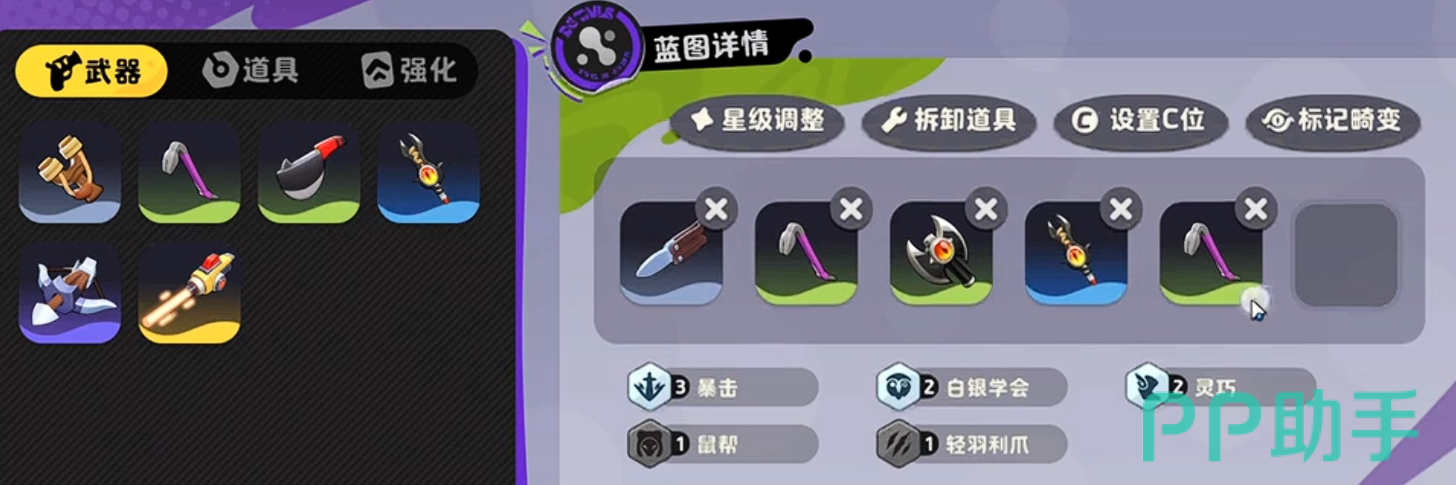 游戏当中如果大家玩的是弥克斯,其实更建议大家去玩他4暴击加上4灵巧的毒狗流,这个流派的能力基本就是羁绊效果来进行触发,而其中的核心角色一般大家就是用的这个弥克斯了,这个角色的技能当中是可以在基础的武器用法当中多给一个武器槽,后期在上阵的时候除了角色自身的各种技能使用方法之外,在有经济的情况下建议蓝图这里可以选择小刀、钢管、斧子、剪刀之类的武器,这样的话前期就可以快速组成4暴击的能力,而且这部分的武器效果也比较符合弥克斯的能力他前期在近战效果当中确实是比较出色一些的,而灵巧这里的话大家就要选择钢筋、菜刀、长剑、弓弩之类的武器,有这样的搭配之后大家就可以正好组合成4暴击加上4灵巧的效果了。