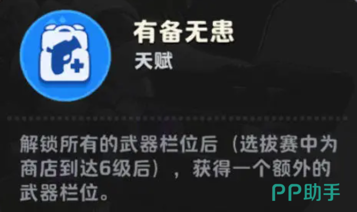 通过各种奇怪的技能效果,大家可以保证他的走位有破绽的时候也不会受到敌方更多的攻击,因为他一发黑洞的能力就可以把这种分散的敌人全部都吸到一起,达到强势的清场效果,而在天赋能力上面,还有一个有备无患的天赋能力,是属于弥克斯核心的效果,这个天赋目前在使用的时候是最多的,能够用到的地方也最多,通过有备无患这个核心的能力,他解锁了自身所有的武器栏位之后,在选拔赛当中,其实只要商店到达六级以后,也就是说解锁了6个槽位以后,他还可以获得一个额外的武器栏位,可以多搭配一个武器效果,所以当前这个能力给他带来的上限度不是最高的,别的特工最多的情况下也只能拿到6把武器,但是弥克斯最多的情况在这里是能够拿到7把的,所以大家千万不要小看这多出来的一个槽位,也通过这个多的武器槽位他就可以多出来一种羁绊能力,或者是多出来一份输出数值。