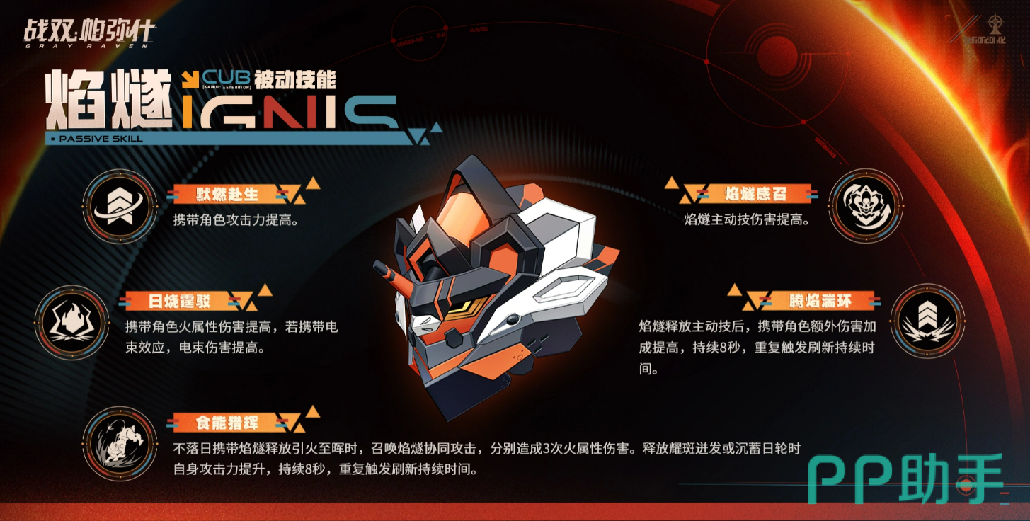 焰燧的定位是战术辅助型,整体设计围绕着火属性伤害展开。被动技能这块,焰燧能给携带角色提升攻击力,同时还能强化火属性伤害。如果携带角色身上有电束效应,电束伤害也会跟着涨,这个设计对于混搭属性的玩家来说挺实用的,不用担心属性浪费。