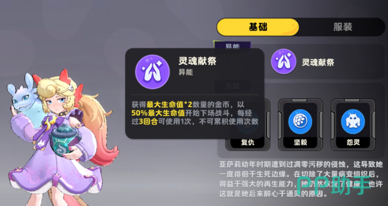 亚萨莉的实战强度与战局节奏深度绑定:连败次数越多,其经济收益越可观。核心机制之一是“灵魂献祭”天赋——每次激活异能时,可获得相当于最大生命值2%的金币;每3回合还可额外触发一次该效果(不可叠加),为中后期装备成型提供稳定资源支撑。这一设计使其在资源积累阶段具备显著优势,尤其适配长线运营流派。