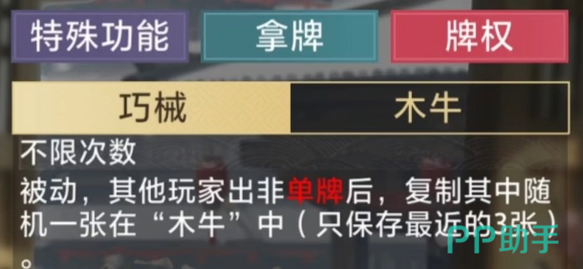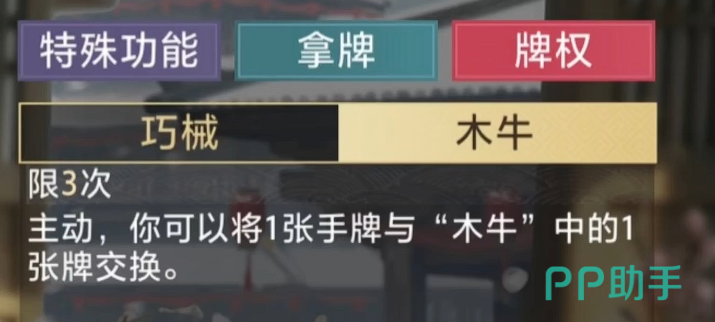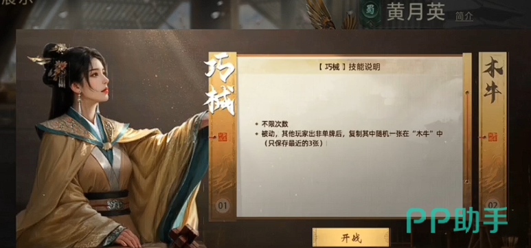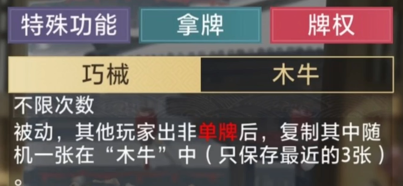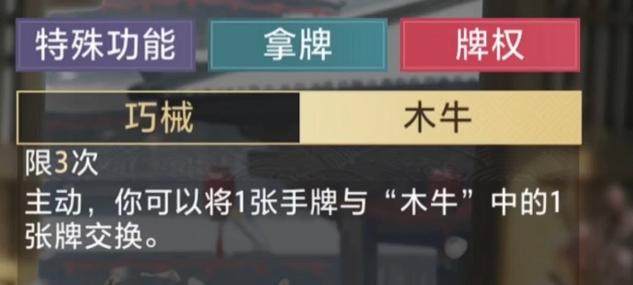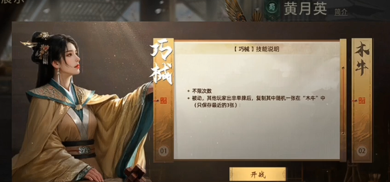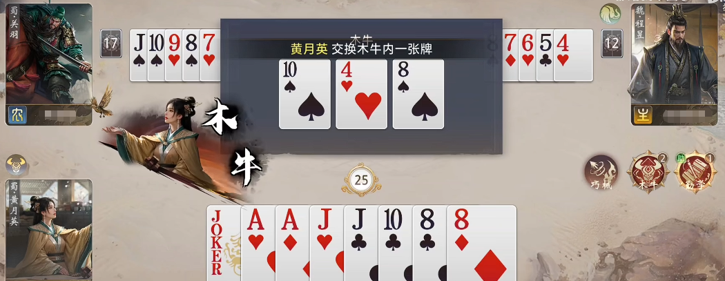 【木牛】存储区容量恒定为3张牌,所有经由【巧械】复制或主动交换进入的卡牌均计入该限额。被换出的手牌不会消失,而是暂存于木牛中,等待下一次调换机会重新调入。这一设计赋予黄月英持续优化手牌组合的能力,但也要求玩家严格管理存储空间——优先保留高适配性、低重复率、易融入主流牌型(如顺子、连对)的关键点数牌,避免因误存冗余牌导致后期关键交换失效。