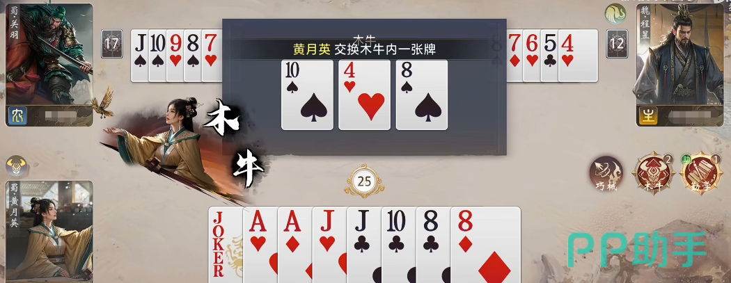 黄月英拥有两个关键技能:主动技【木牛】与被动技【巧械】。其中【木牛】为回合内可触发的主动交换机制——每次使用时,玩家可在自身手牌与木牛存储区之间任意调换一张牌。该技能单局限用次数,但每次交换均直接影响牌型构建:例如补足顺子缺失的中间数值、拼齐连对所需重复点数,或凑成四张同点炸弹。需注意,此技能无法干预敌方手牌,仅作用于己方资源调度,因此每一步交换都需结合当前手牌分布、剩余出牌阶段及后续可能的压制需求进行预判。