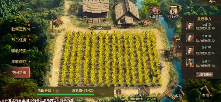 “屯田之策”是本次活动的主线玩法。玩家将使用两种专属工具——锄头(用于开垦荒地)与镰刀(用于收割作物),每次操作均可获得“成长值”,用于提升个人荒田等级。成长值积累不仅影响效率,还直接关联奖励产出。操作过程中,系统将随机掉落粳稻、金刀、武勋、将令、大泉铜钱等实用资源,掉落组合不固定,具备一定随机性与探索感。