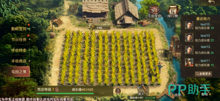 本玩法特别加入协作机制:主公可前往好友的荒田协助开垦。每次助耕双方均能获得成长值,实现双向增益。但每日助耕上限为3次,助耕累计最多可获10个粳稻;而自身操作(犁地+收割)每日粳稻获取上限为20个。建议优先完成自身额度,再合理分配助耕次数,以最大化粳稻收益。