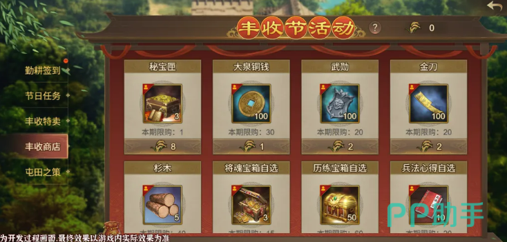 “丰收商店”为本次活动资源转化终端。粳稻作为唯一通用兑换货币,来源覆盖三大模块:勤耕签到、屯田之策、节日任务。商店内上架多项高价值物品,包括限定宝物【断铠双刀】、大泉铜钱、金刀、武勋、玉符等。其中【断铠双刀】为稀缺性道具,建议有需求的玩家优先储备粳稻,确保兑换资格。