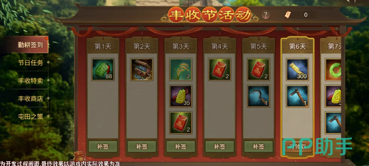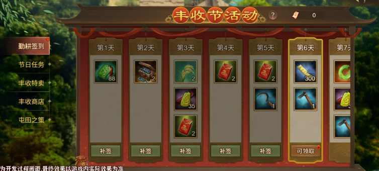 “勤耕签到”为轻量型日常福利模块。活动期间每日登录即可领取当日签到奖励,内容涵盖资源、道具及稀有材料。若某日遗漏签到,支持通过“补签券”或消耗20枚玉符进行补领;其中玉符每日限补一次,补签券无使用次数限制。补签券可通过参与“屯田之策”获得,形成玩法与福利的正向联动。