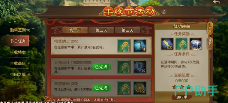 “节日任务”采用分阶段开放机制。活动开启后前三日,每日解锁3个基础任务,完成后可领取大泉铜钱、粳稻等奖励;活动后期将追加2个高难度特殊任务,对应更丰厚的资源回报。需特别注意:仅在活动开启后新建的剧本中完成的任务方可计入进度,已存档剧本不参与统计,请玩家在启动任务前确认剧本创建时间。