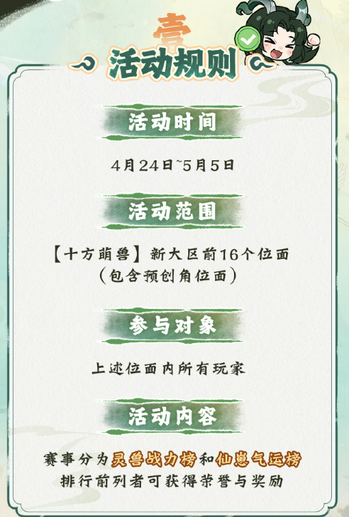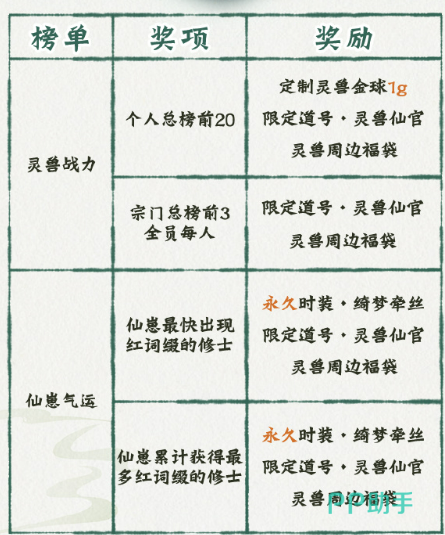这次活动一共分成两个方向来比拼,分开算排名,奖励也是各自独立的。第一个叫灵兽战力榜,简单来说,就是拿自己手里最强的那只灵兽,去和其他仙友比战力高低。如果你养了好几只灵兽,不用担心哪只会拖后腿,系统只会取你战力最高的那只,来计入排名。所以这个榜比的,其实就是谁的头号灵兽更强,堆资源的方向也比较明确,就是专心把最强的那只,养起来就行了。