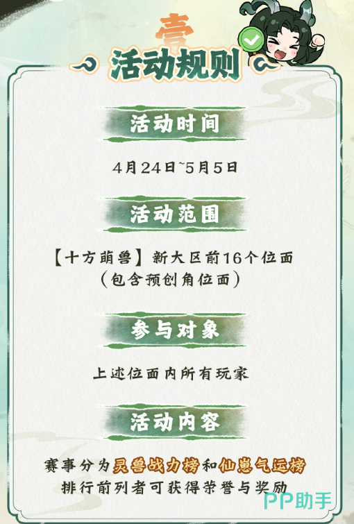 这次十方萌兽限定灵兽挑战赛的奖励种类,还是比较丰富的,不同的玩家,可以按自己的情况,来选择主攻哪个榜。养了强力灵兽的,就去冲战力榜,日常刷材料比较勤快的,可以试试气运榜,两边都有余力的话,当然可以一起冲。活动时间有限,感兴趣的仙友,记得提前做好准备,4月24日一到就能直接出发。