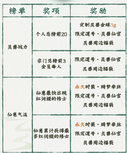说到奖励,这次的东西,还是比较有诚意的。战力榜个人总榜前20名,可以拿到灵兽周边福袋、限定道号,还有定制灵兽金球1g。金球这个东西对养灵兽帮助不小,平时搞起来也挺费劲的,能白拿当然最好。宗门榜这边,前3名宗门的全体成员都有福袋和限定道号可以领,不是只有宗主一个人拿,这一点还挺好的,对那些宗门凝聚力比较强、配合也比较默契的团队来说,这个奖励激励感还挺足的。