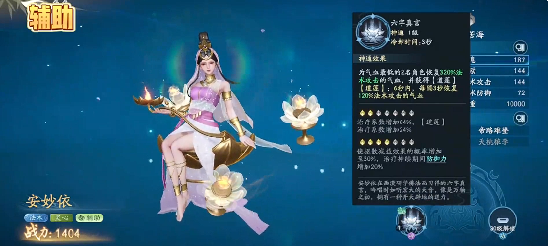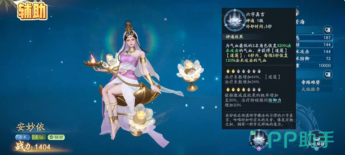 但是如果大家是想要用一个比较好用的复合类型的角色,在这里辅助定位当中,大家可以选择的是安妙依,这个角色在主动技能效果当中,可以通过法术攻击带来320%的攻击能力,而且对于目前生命数值当中最低的其他队友,还可以进行单体的治疗,虽然是一部分的治疗效果可以生效,但是她被动能力基本是每6秒就可以用到一次的,其中带来的两次治疗效果,基本都是一些持续治疗的效果,所以大家也不用看她单体治疗的数值是比较低的,另外有持续治疗以后,她能够带来的各种恢复能力就比较高了,这里每一次恢复量当中都有120%法力的提取数值,而且通过后期道莲的层数,也可以叠加自身更多的治疗效果,在第一层的治疗效果当中,会有64%的治疗量提升,而第二层里面也会有24%的提升,这样虽然一段比一段少,但是她一直是在持续稳定给我方带来治疗的,那么在我方需要的各种生存能力当中,就可以依靠她的技能,后期他还可以给我方全体的队友都提供20%的防御力加成,这样在队伍整体的容错率上面就会大很多了。