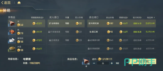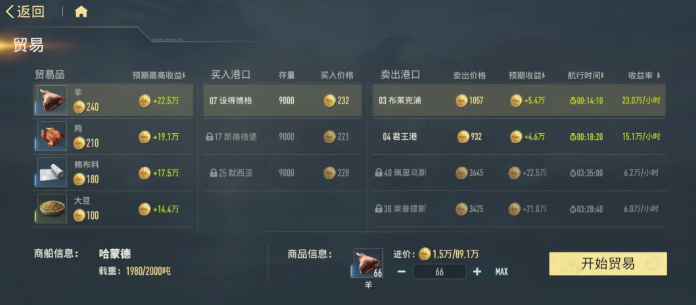 而另外在金币获取上面建议大家首先去选远洋贸易系统来获取,除了前期的港口税收之外,这个途径获取金币的数量也是最多的,这个贸易系统大家解锁了之后,其实不同的运输任务在派遣货船去执行的时候,全程线上运营都可以让大家在其中拿到足够多的货物交换流水,而且初始情况下,大家可以拿到两艘货船上面的贸易任务,而通过这样的贸易任务,大家可以随其中的进度来逐步检索每一艘货船当中的不同货物,那么货物数值装载越多的情况下,后期在能够拿到的金币数量上面自然也会越多,而且这里货船的等级也会影响到单次的载货量,因为载货量一般就代表这次航行大家可以拿到多少金币,结算的金币数越多的情况下,就代表大家使用的货船越多。