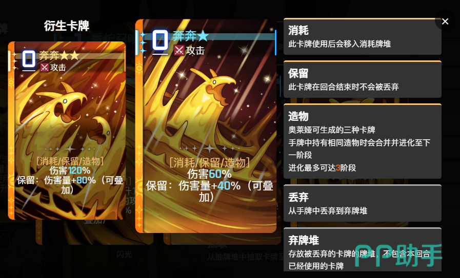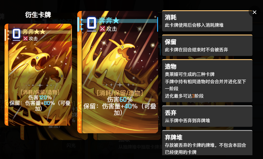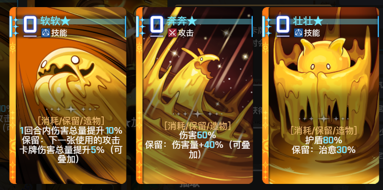 而且其中的三个创造物卡牌,基本都是0费类型的卡牌效果,使用软软的情况下,大家就可以看到上面一个回合之内的伤害数值会增加10%的效果,而且还可以保留接下来其他使用的攻击卡能力,伤害数值后期还可以增加5%,奔奔的话能够带来的功能效果也是此类基础加成,但是在基础伤害上面也有60%的加成效果,后期保留下来之外,可以额外增加40%的伤害能力,而且奔奔的增伤在这里也是属于一类加算的,其实可以进行计算,放在技能基础的数值上面可以带来的提升也就不少了,这里在很多稳定的输出场景当中也是可以用起来的。
