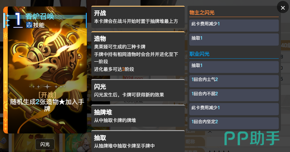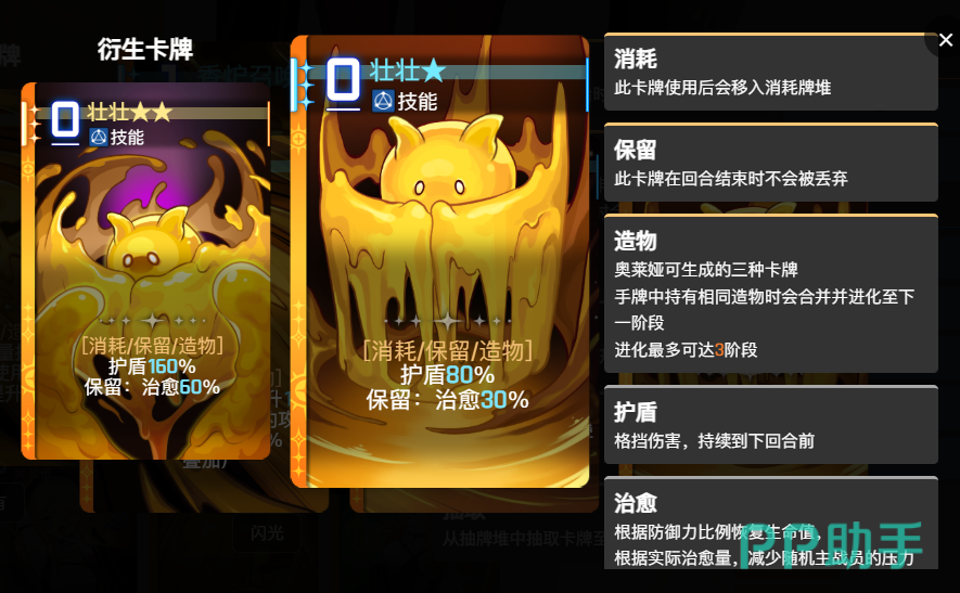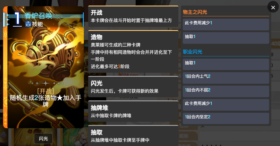 奥莱娅卡组当中,大家可以用的就是神圣香炉,神圣香炉这个技能卡当中可以生成两张创造的能力,而且因为修女这个角色身上有三个类型的创造物卡牌,所以用法上面是不一样的、创造物卡牌当中包含了壮壮、奔奔、软软这样不同类别的卡牌,当中均带有不同的词条效果,比如其中的壮壮对应的就是创造的能力,而奔奔的话对应的是保留的能力,软软的话对应的是消灭的能力,所以在后期技能循环当中,这3个创造物卡牌效果的呀,要挑选使用,卡牌能力各自在不同的战斗方面担任的职责也是不一样的,所以对于这3张冲锋卡牌,大家要保持自己搭配的同时,手中最好是要有两张一星的传统卡牌,这样的话快速的融合到一张二星的创造物卡牌,如果前期拿到的是一星跟二星的透明卡牌的情况下,这里是可以直接融合到三星的,但是三星卡牌无法通过两个二星卡牌来进行合成。