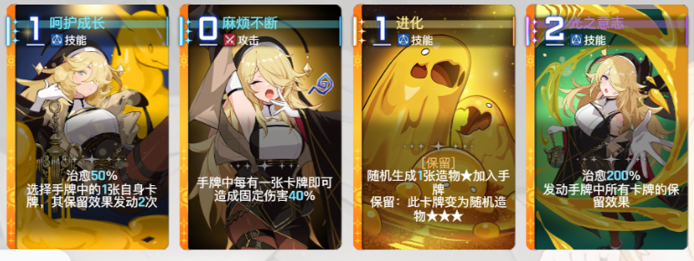 修女在游戏当中达到5星强度的时候,其实在这里能够带来的控制也不少,在战斗当中的机制当中可以通过各种卡牌能力来进行场内操控,目前游戏当中的修女叫做奥莱娅,奥莱娅自身的基础卡包效果当中有两张1费的卡是可以用来攻击的,这里攻击卡当中大家前期是要放出来保证她的输出强度,另外在治疗卡当中有一张1费的能力可以用出来,而且她核心的效果基本都是依靠这里创造物的能力来进行提升的,所以目前在初始的情况下有创造物的时候,奥莱娅能够用的能力会更多一些。