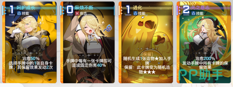 作为一个1费的技能卡,如果使用的情况下,建议大家可以用这张卡来触发两次预留的效果,这样的话大家在其中也可以跟其他的中立卡牌搭配在一起使用,比如前期如果大家拿到了一星的壮壮,从30%的治愈效果当中这里是可以直接提升到60%,也是通过这样的预留效果来进行提升的,而这里通过这样的一个能力,可以获取到促进成长的话,也会自动降低其中使用的费用,所以用到这类卡牌的时候,虽然会增加费用,但是也会减掉其他词条的效果,效果方面的话也会变成一些复制手牌的创造物,另外麻烦这类卡牌是攻击的情况下直接0费就可以用的,所以在伤害方面的话,用起来大家手牌数量也会增加起来。