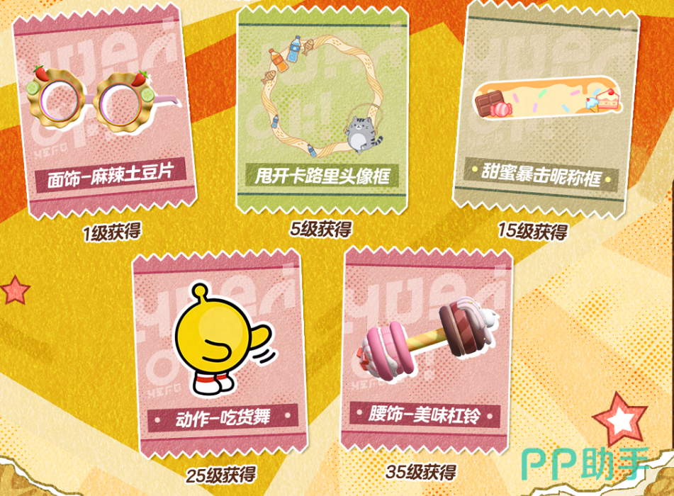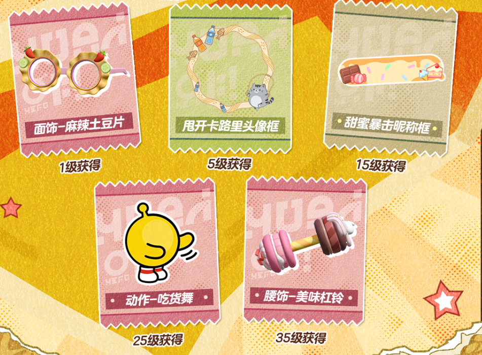 本季派对手册分基础版和高级版两部分。基础版拿到800潮流纤维、17500瓶盖,还有稀有表情"嚼嚼者"、配饰"薯饼"、头像框"脆脆曲巧",以及高级装扮"零食套装"。升级成高级版之后,奖励就更多了,总价值3288蛋币,包括蛋币、彩虹币、染色剂,还有典藏动作"吃货舞"、典藏配饰"美味杠铃"和"麻辣土豆片",以及稀有盲盒"盖浇饭"和"饮料罐"外观,内容还是挺丰富的。