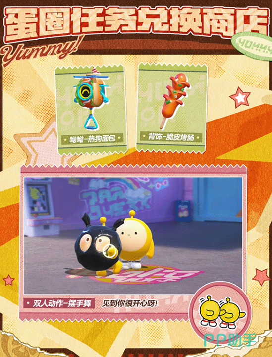 蛋圈任务也在同步开放,和蛋圈成员一起组队完成任务,可以兑换呦呦"热狗面包"、配饰"脆皮烤肠"和双人动作"摆手舞"。另外,本季盲盒外观有专属彩蛋,蛋仔接受炸鸡三宝的健身邀请,并成功举起杠铃后,会触发神秘变化,具体效果进游戏自己看更有意思。