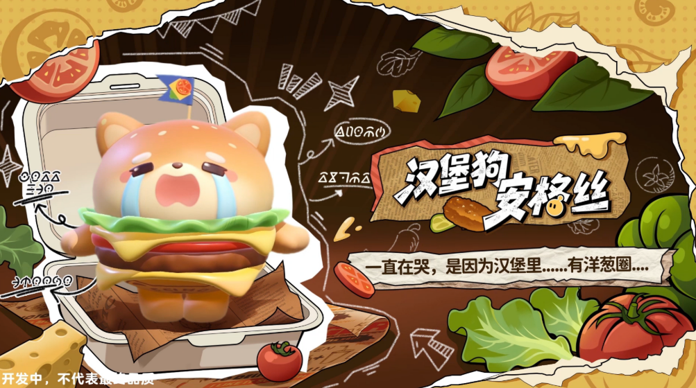 汉堡狗安格丝,是这次另一个很有特点的角色。它是柴犬和牛肉汉堡的结合,耷拉着耳朵,脸上总是一副快哭出来的表情,但偏偏就是这副样子,让人特别想靠近它。面包胚软软的,肉饼厚实,还有芝士酱和洋葱圈,光是描述就已经很香了。安格丝的设计很聪明,把食物和动物的特点融在一起,看着可爱,细节又很丰富。