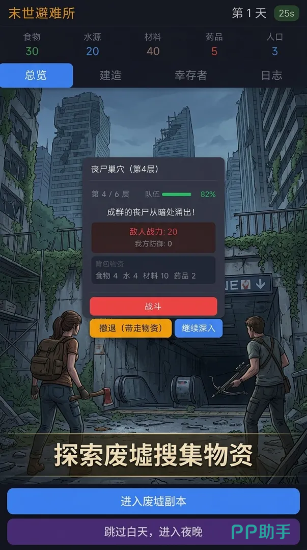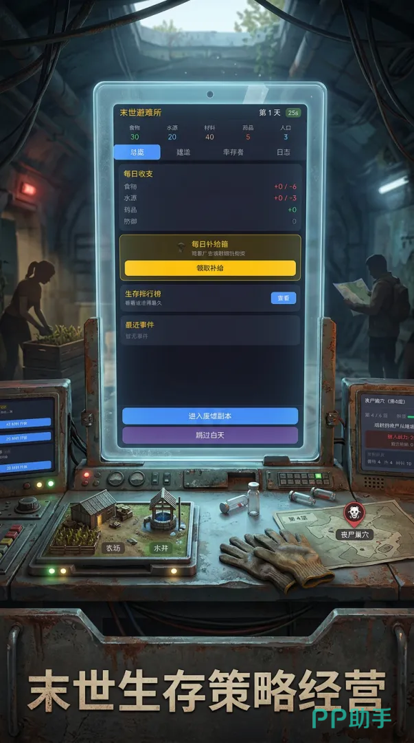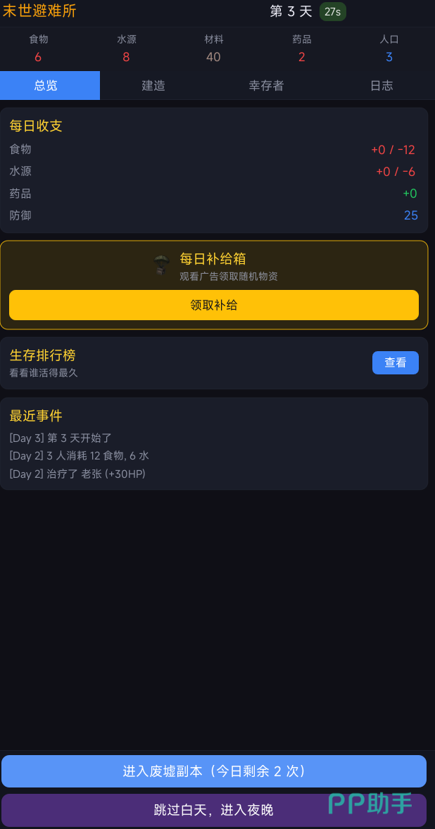 末日避难所其实就是一款比拼谁生存的时间更长一些的生存游戏,在这款游戏中,玩家的生存时间会被详细的记录下来,玩家可以通过屏幕下方的进入废墟副本和跳过白天进入夜晚等不同的选项来完成不同的内容,你夫婿副本每天只能够打2次,建议大家可以等自己的实力在强一些在去进行挑战,而跳过白天进入夜晚这个选项,则会直接让玩家将白天给直接跳过去,直接进入到更加危险的夜晚。