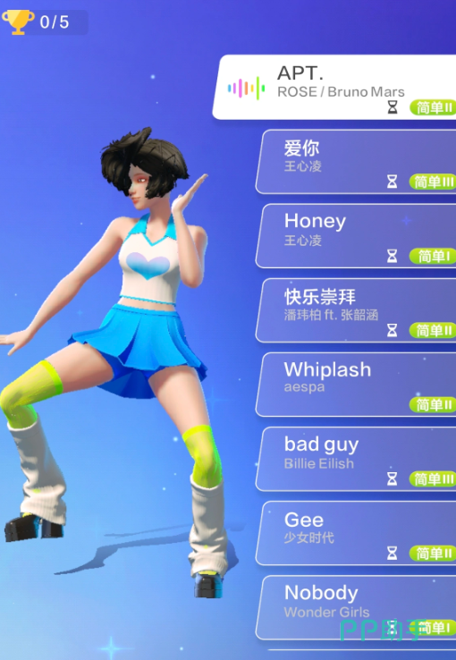 对初次接触体感舞蹈的人来说,从简单系列开始是最合适的。简单I到简单的III曲目BPM(每分钟节拍数)一般都在80-120之间,动作编排主要是基础的手部、腿部动作,重复次数较多。这一阶段的目的就是使玩家对摄像头的捕捉范围有初步的认识,形成基本的节奏感,学会跟随屏幕角色舞动。当玩家在简单的III模式下很容易获得高分的时候,就说明他已经具有了进阶的基本能力。
