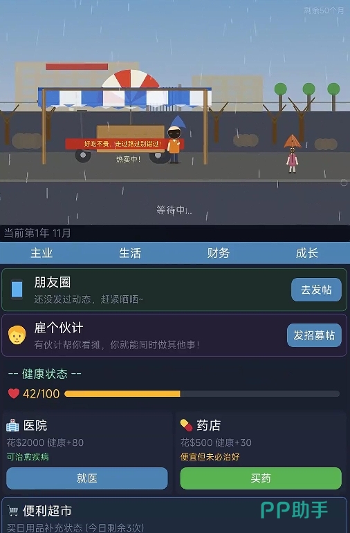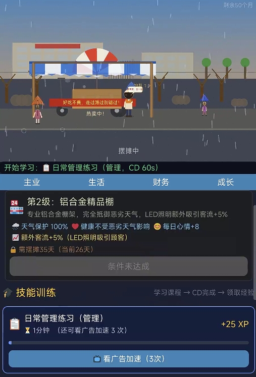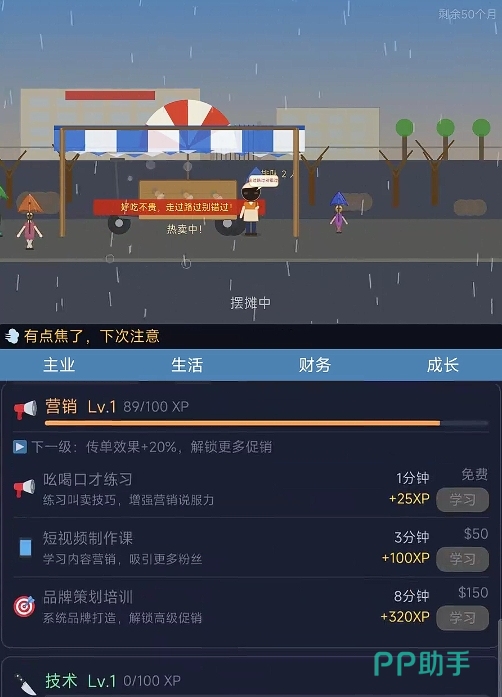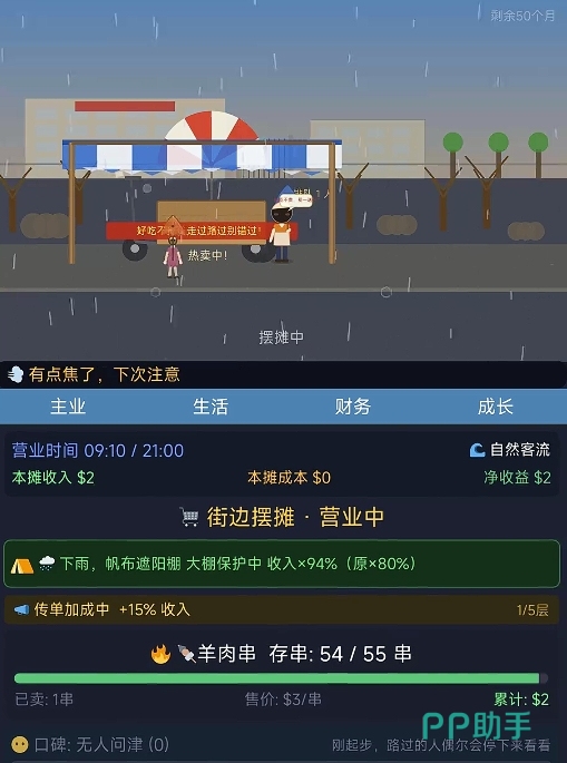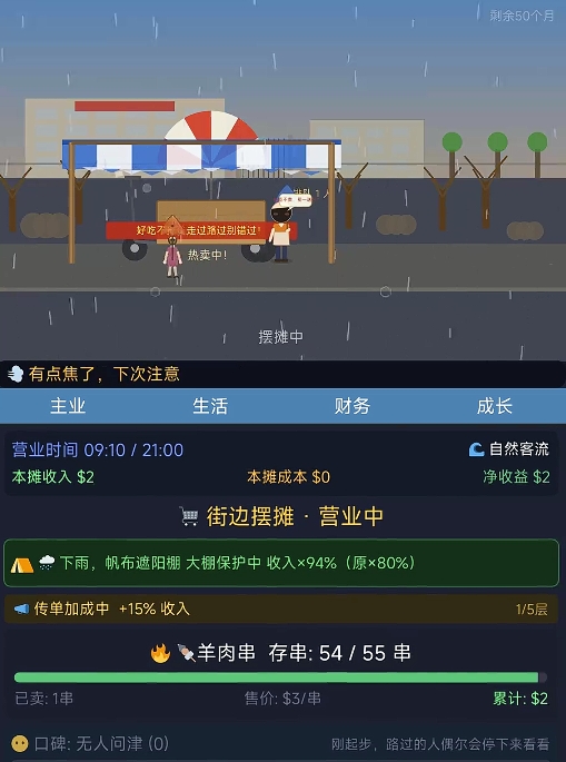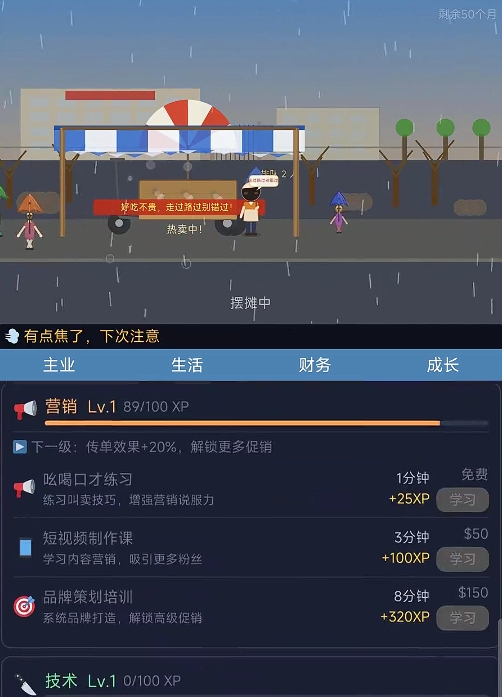 此外,游戏所设计的经营玩法也有着极高的策略乐趣。不管是每天所进的食材、提升自己各项能力所需的资金,都会算在成本里,这也意味着玩家们需合理地去使用每天出摊所赚取到的收入,确保每一次资金支出都能花在有用的地方,因此玩起来很有自己真的在进行创业的即视感。最重要的是,若是玩家们通过摆摊卖烧烤成功还清了所有的债务,还能以烧烤摊为基础,去建立属于自己的商业帝国,转变自己的人生。