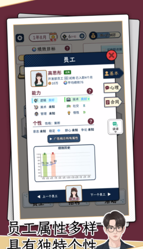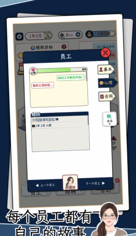随着在游戏里不断完成各项任务和挑战,玩家的职级会逐渐升级,有机会在游戏里解锁更多权限,让公司规模不断扩大,最终从普通的小公司,逐渐成为令世界瞩目的高精尖企业,但是在游戏里完成挑战,能看到个人的成长路线,喜欢游戏的可以来尝试一下,通过大量的文字挑战,感受真实的HR模拟。