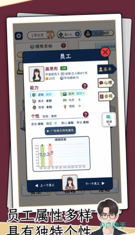 HR模拟器手游玩法已经在上面分享出来了,挑战过程中会设定大量事件,游戏过程中要根据员工特性和个人能力,制定相应的发展规划和岗位晋升,保证公司能出现更多人才,作为游戏里的HR,玩家拥有极高的自由度,可以自由决定员工去留。