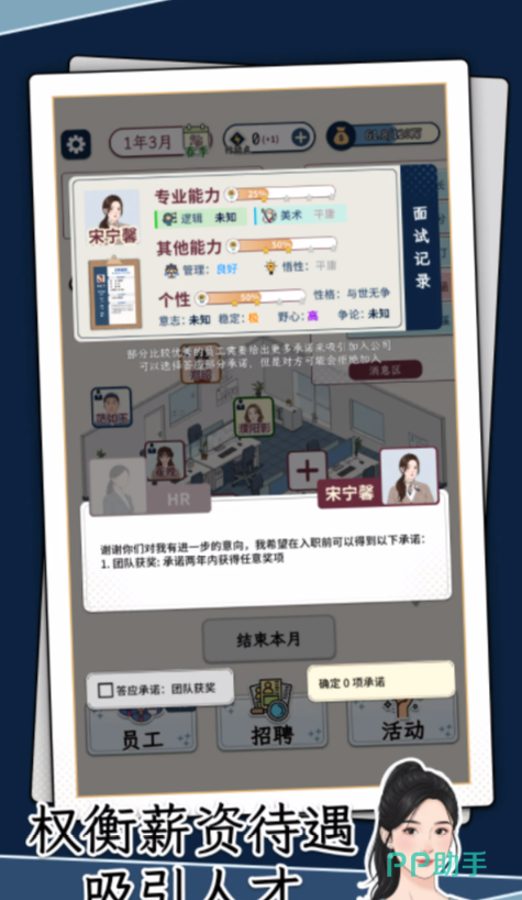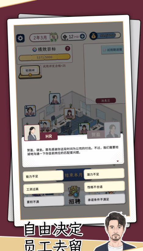 除了完成招募员工之外,每天都会有大量的员工想要加薪升职,或者在工作过程中摸鱼,玩家需要权衡公司整体的预算设定考核标准,每月及时清退满意度较低的成员,但在考核的过程中需要融合一些温情的人关怀,否则会导致整个员工的公司都提出离职的情况,公司会无法运转,在招募过程中会有大量不同的成员角色,每个角色都会有自身独特的性格和背景故事,面对挑战,玩家要处理各种内讧事件,帮助公司留住骨干员工,假如出现公司恋情,需要及时解决。