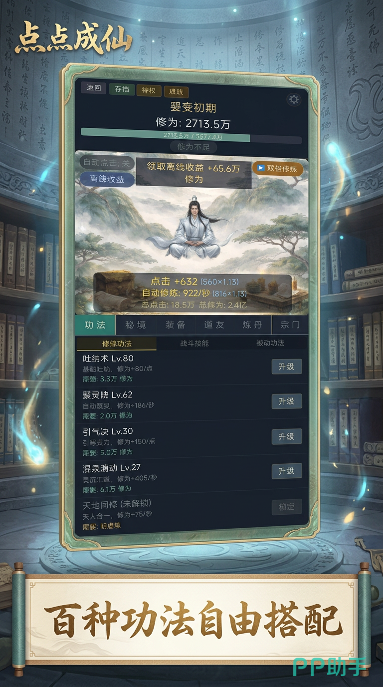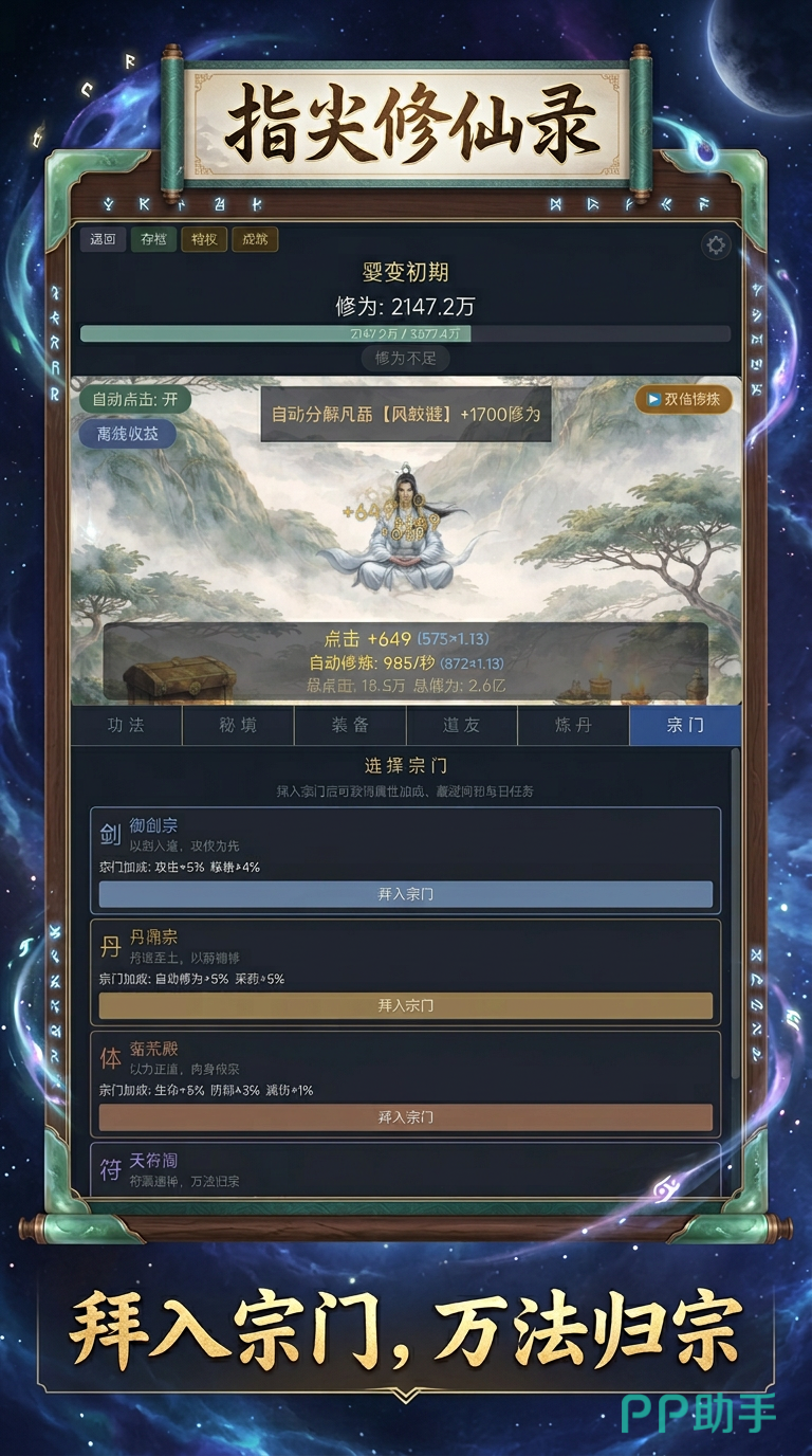 综上,《我只是点点怎么成仙了》以极简交互承载完整修仙成长线:从点触聚灵起步,经由洞府经营、功法配置、秘境闯关,最终达成飞升目标。合理规划资源、善用离线机制、把握升级优先级,是稳步登临仙道巅峰的关键路径。