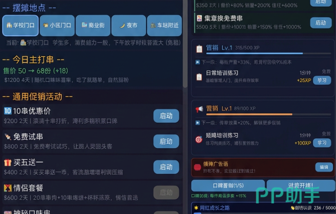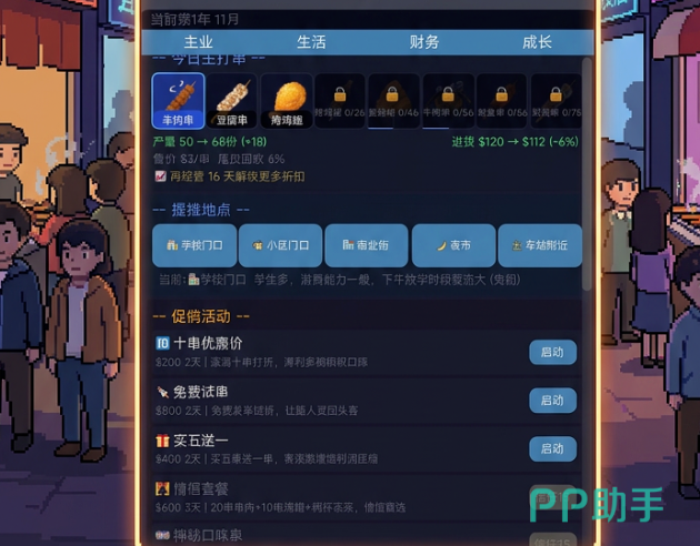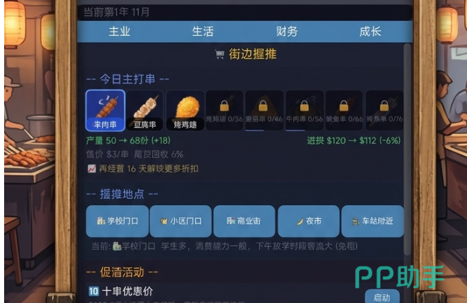 首日操作切忌盲目点击,应优先熟悉主界面核心信息模块:实时天气影响客流与食材保存,体力值决定当日可执行操作次数,健康值关系到持续出摊稳定性,日期则关联季节性价格波动与活动周期。成长板块涵盖技能、口碑、设备等长期发展维度,需有意识逐步激活。特别提醒——体力低于30点将无法完成烤制动作,健康跌破40将显著降低顾客复购率,因此每日需合理分配时间,避免无效消耗,确保状态处于可稳定运营区间。选址是首步关键,推荐新手固定驻扎于高校正门区域,该点位日均人流量稳定、消费意愿强、价格接受度高,利于前期现金流快速回正。