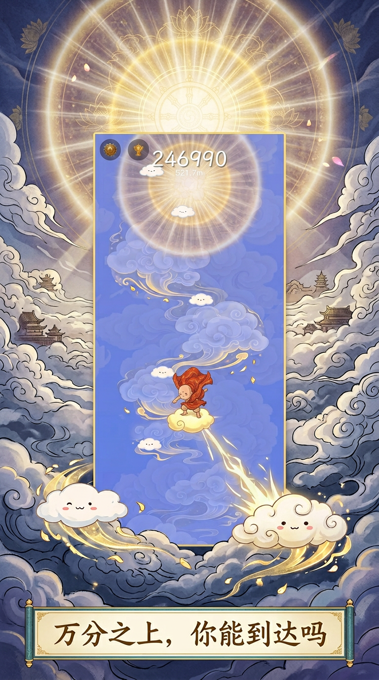 《唐三藏彩云之上》是一款以西游题材为背景的轻量级跳跃闯关手游,凭借极简的操作逻辑与富有节奏感的云朵机制,成为当下广受欢迎的碎片化休闲选择。游戏核心玩法围绕“踩云跃升”展开——玩家操控唐三藏在浮空云层间连续起跳,借助不同特性的云朵组合实现高度攀升,目标是突破层层关卡、冲击更高分数。