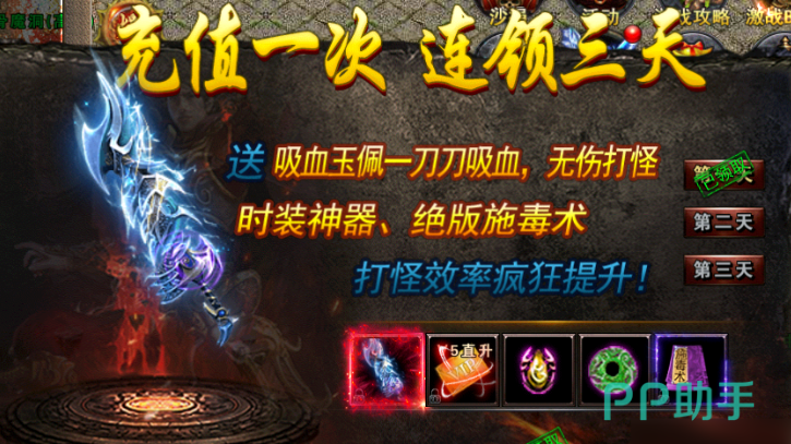 首充礼包为新手阶段最具性价比的投资选择。完成首次充值后,系统将连续发放3日专属奖励:首日赠“吸血玉佩”,实现低风险无伤通关并强化时装效果叠加;次日赠送VIP直升卡与清怪效率增益道具;第三日解锁顶级剑法技能,该技能在PVP对抗中具备显著压制力。开通特权后,玩家还将享有更高宝物掉落率、自动元宝使用机制、经验获取加速及装备属性回升比例提升等多项优势,整体开荒效率远超普通玩家。