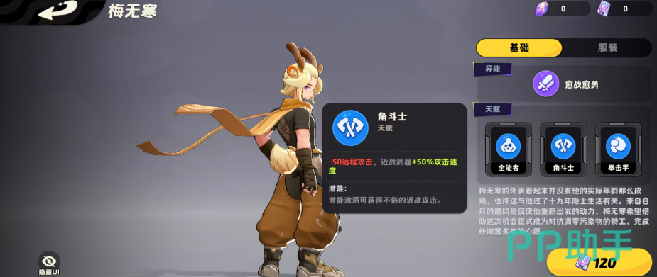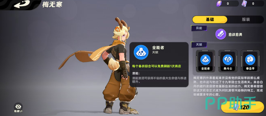 梅无寒首个可解锁天赋为“全能者”,效果是在备战阶段自动提供一次免费商店刷新机会。由于商店武器完全随机,该能力大幅降低了玩家为匹配理想武器而反复消耗金币的风险。同时,该天赋激活潜能后,可永久提升最大生命值与移动速度,基础增幅为4%,且随天赋等级提升同步增加百分比数值,构成可持续强化的生存底座。