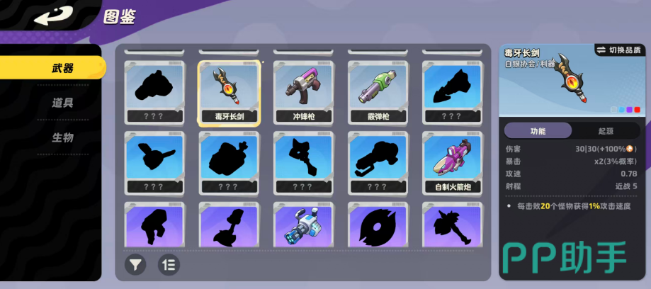 新手开荒阶段,毒牙长剑是低门槛高性价比之选。该武器隶属白银协会阵营,基础攻速加成优秀;每击杀20名敌人后还可永久提升1%攻击速度,形成滚雪球式成长。随着后期白银协会武器数量增加,将自动激活阵营羁绊——两件触发“生命汲取+2%”,六件满配可达“生命汲取+10%”,同步提供持续续航能力。