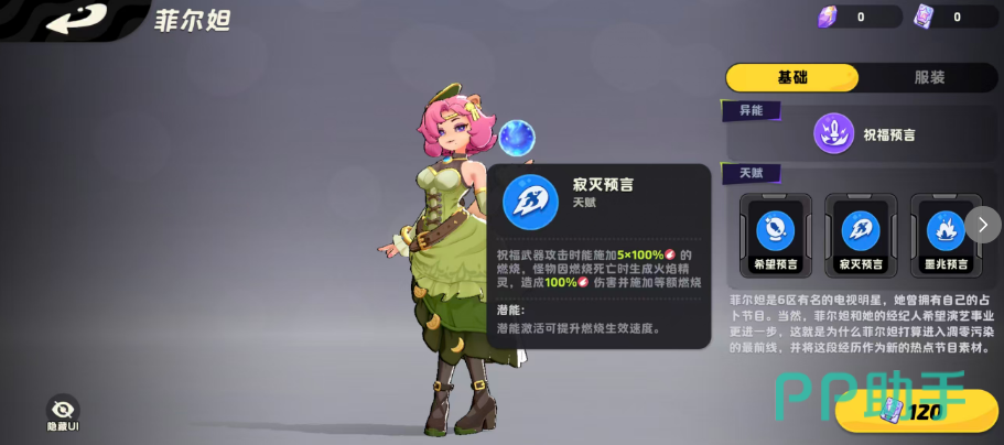 第二个天赋“寂灭预言”强化了火属性持续作战能力——当武器附带祝福效果时,菲尔妲每次攻击均可对目标叠加5层100%触发率的燃烧状态。若敌人因该燃烧效果死亡,则自动召唤火焰精灵,后者同样造成100%火属性伤害,并同步施加等量燃烧层数。该机制显著提升了燃烧生效频率与覆盖率,在搭配高频率火伤武器时可实现稳定DOT压制,是构建纯火队的核心支撑点。