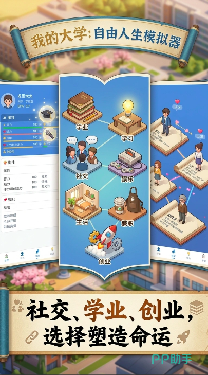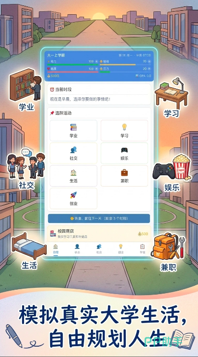 《我的大学》手游目前尚未公布正式上线日期,但已进入内部测试阶段。这款以文字驱动为核心的校园模拟游戏,通过高度拟真的机制还原大学四年成长轨迹——从专业填报、课程修读、社团加入、校外兼职,到创业实践与学业进阶,玩家的每一次抉择都将实时影响角色属性数值及最终人生走向。