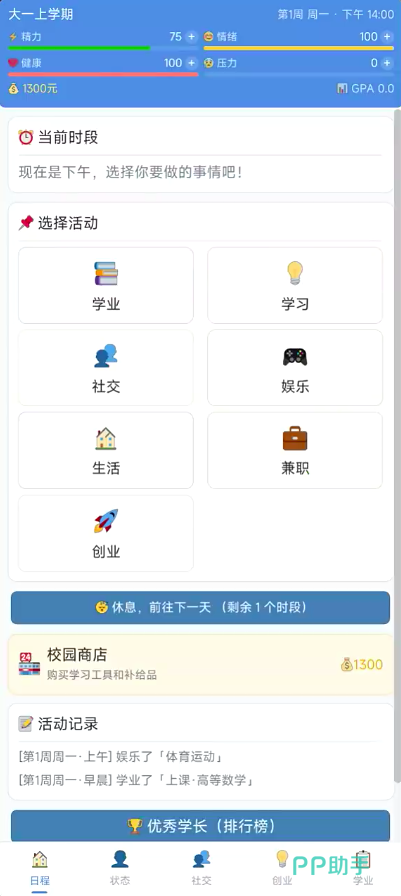 在内测反馈中,大量玩家表示游戏唤起了真实的大学记忆:自由选课系统、多线程社团活动、阶段性考试压力、人际关系构建等要素均被细致拆解为可交互的文字模块。世界观依托简洁的表格结构展开,不依赖复杂建模,却完整承载了专业选择、必修课进度、选修课匹配度、社团活跃值、兼职时长与收入转化率等关键变量。所有行为均触发动态数值演算,期末成绩、心理健康指数、压力值、体能值、社交亲密度等核心参数持续变化,最终导向数十种差异化结局。