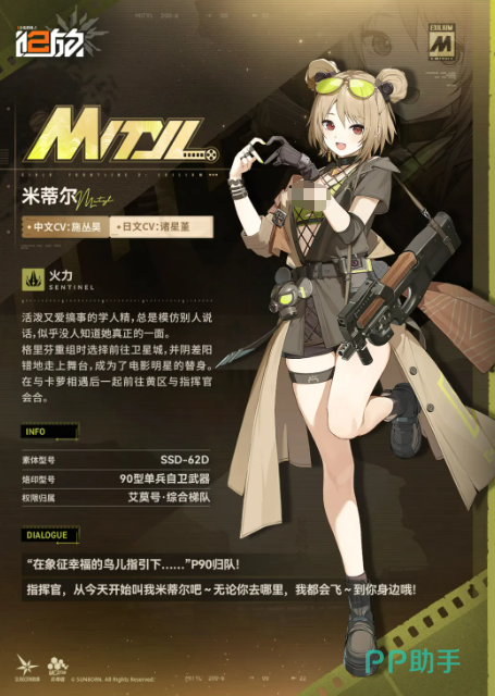 《少女前线2:追放》近期上线了全新火力人形——米蒂尔(P90)。作为SSD-62D素体、烙印型号为90型单兵自卫武器的战术单位,她隶属于艾莫号综合梯队,职能定位为火力,职业类型为SENTINEL。这一设定明确指向高频率、高持续性的输出能力,而非前排承伤角色,契合其轻量化突击武器P90的核心特性。