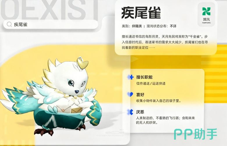 疾尾雀以圆润饱满的鸟类形象登场,体态丰腴、神态憨萌。它并非战场上的锋锐战力,而是扎根于日常生活的“伴随型”月灵。其核心职能明确为信件递送与快递运输——这一设定既呼应了古籍记载中“天月民奉为千金雀”的文化渊源,又巧妙承接了游戏世界观演进至“信心时代”后的社会需求变迁。在旧日传说中,疾尾雀传递的是情感与信任;而在今日城邦中,它承载的是包裹、订单与即时联络。