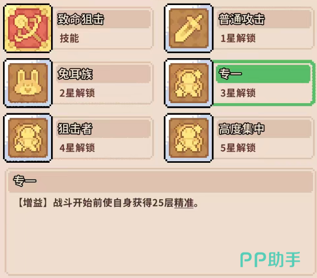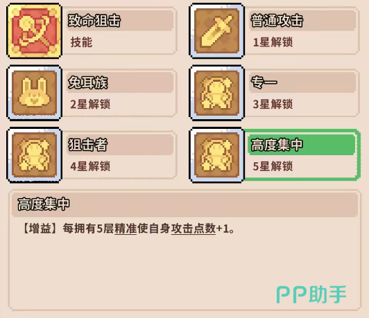 星级成长路径高度聚焦“精准度”体系:三星技能“转移”在战斗开始时即赋予25层精准度;四星技能“狙击者”使每次造成伤害后自动获得3层精准度;五星技能“高度集中”则将精准度转化为常驻攻击力——每5层精准度提升1点攻击数值。全阶段技能设计均围绕精准层数构建正向循环,凸显该角色“层数即战力”的养成逻辑。