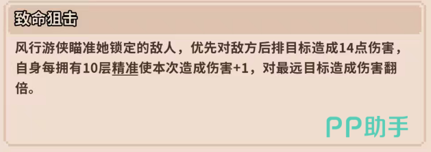 其核心技能“致命狙击”赋予她稳定的锁定打击能力:可优先瞄准敌方最远单位(通常为后排),基础伤害为14点;每叠加10层精准度,本次攻击额外+1点伤害;当目标处于最大射程时,伤害直接翻倍——这意味着她的输出效能与站位距离呈正相关,越远越强,彻底颠覆传统射手“贴边输出”的惯性思维。配合风系队友触发元素加成后,该技能的实战爆发力进一步提升。