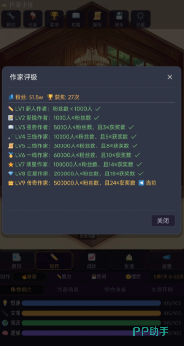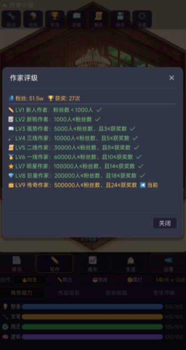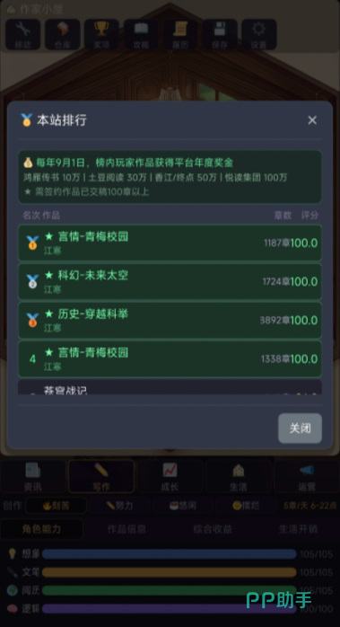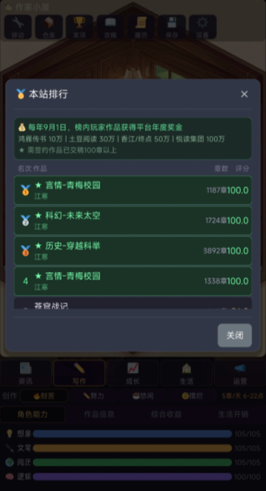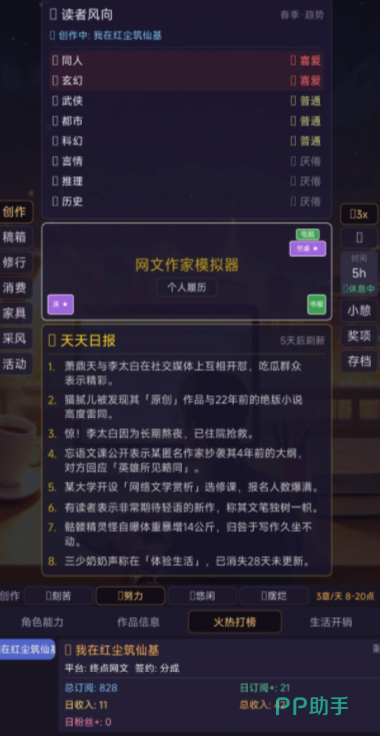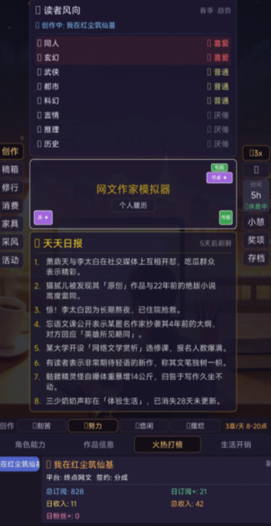 每部作品发布后,除获得金币与签约金外,还将提升作家等级与粉丝基数。随着声望增长,玩家可陆续接入多个虚拟小说平台达成独家合作,实现稳定稿费收入。需注意:角色拥有独立体力值系统,所有写作、投稿、签约操作均需消耗体力,合理安排作息以维持健康状态,是持续产出高质量内容的关键前提。