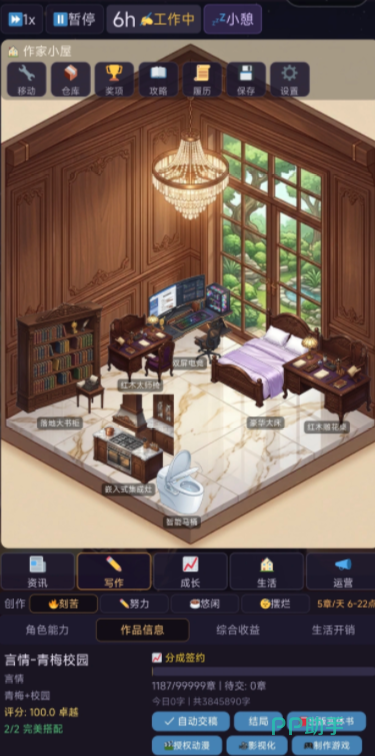 游戏开局需自主规划专属写作小屋——数百种家具支持自由布局与实时拖拽,涵盖书桌、台灯、绿植、书架等元素,营造契合个人风格的创作氛围。完成空间搭建后,即可进入核心创作阶段:依据实时变化的读者偏好与平台风向,选择玄幻、都市、言情、科幻等主流网文分类启动项目。系统采用“时间驱动式写作”机制,设定题材与基础设定后,角色将在24小时制真实时间中自动推进章节撰写;若市场趋势突变,已存档草稿可随时调取续写,灵活应对内容周期波动。